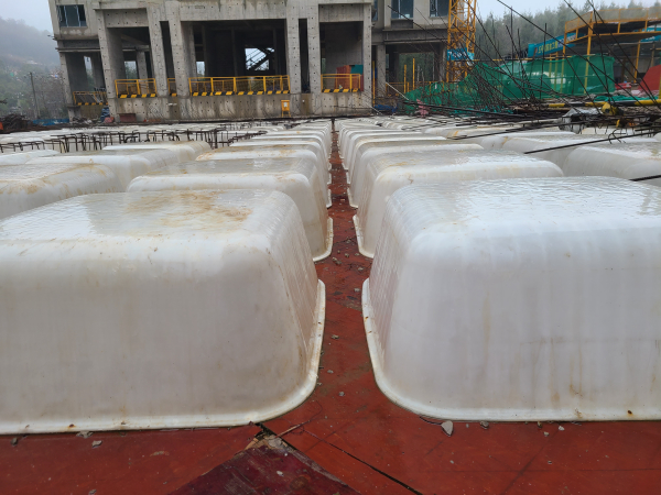 建筑模壳技术性能判断及大承载力:根据密肋楼板尺寸断面,设计模壳的规格,平面尺寸一般为1000×1000mm,高度根据设计密肋楼盖的高度而定。模壳由标准塑料单体组件采用螺栓连接而成,并在建筑模壳四周用水平角钢45°支撑,以提高整体刚度。建筑模壳的承载力不小于3.75kN/m2,以承受砼自由散落时的冲击荷载及泵送砼的冲击力。